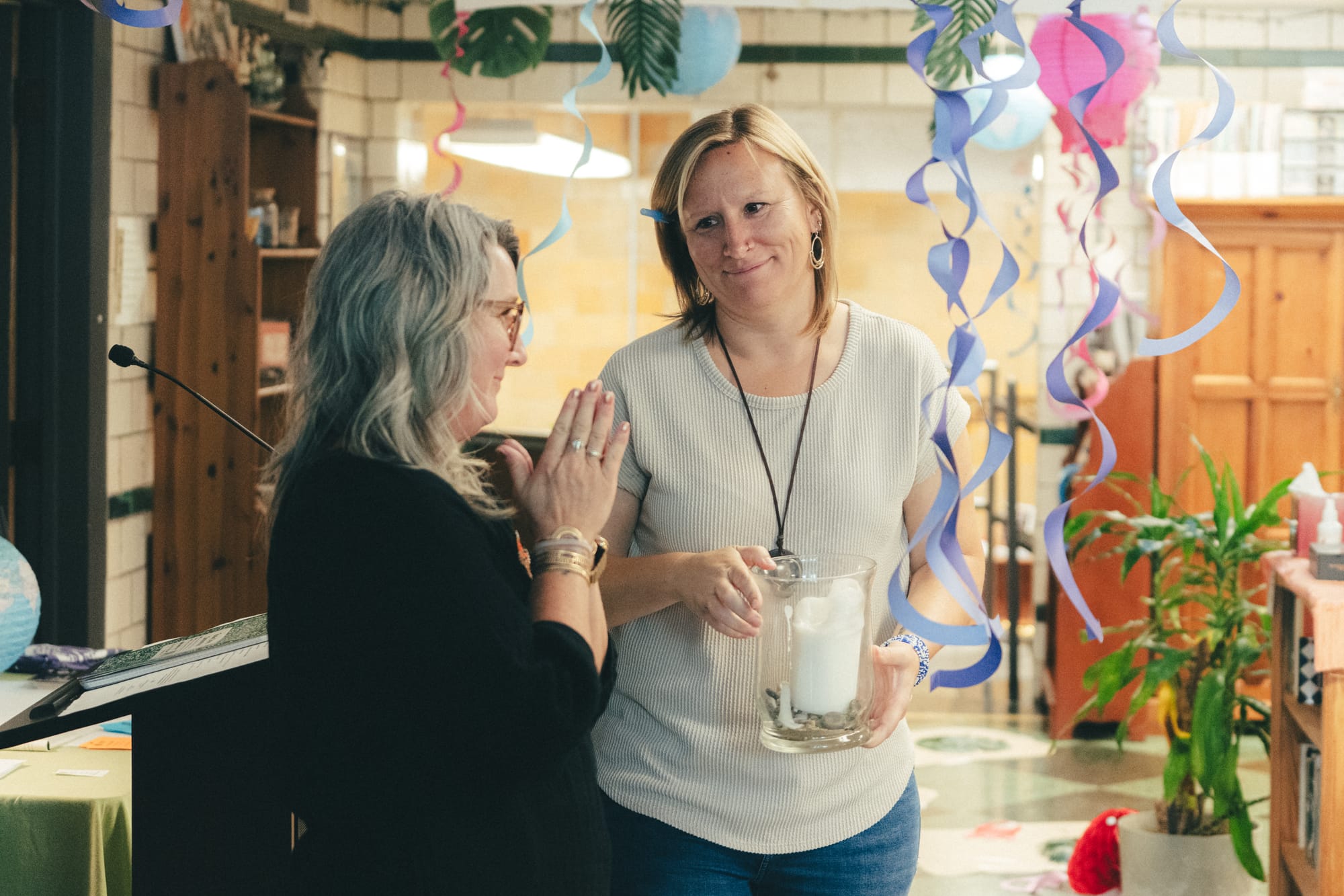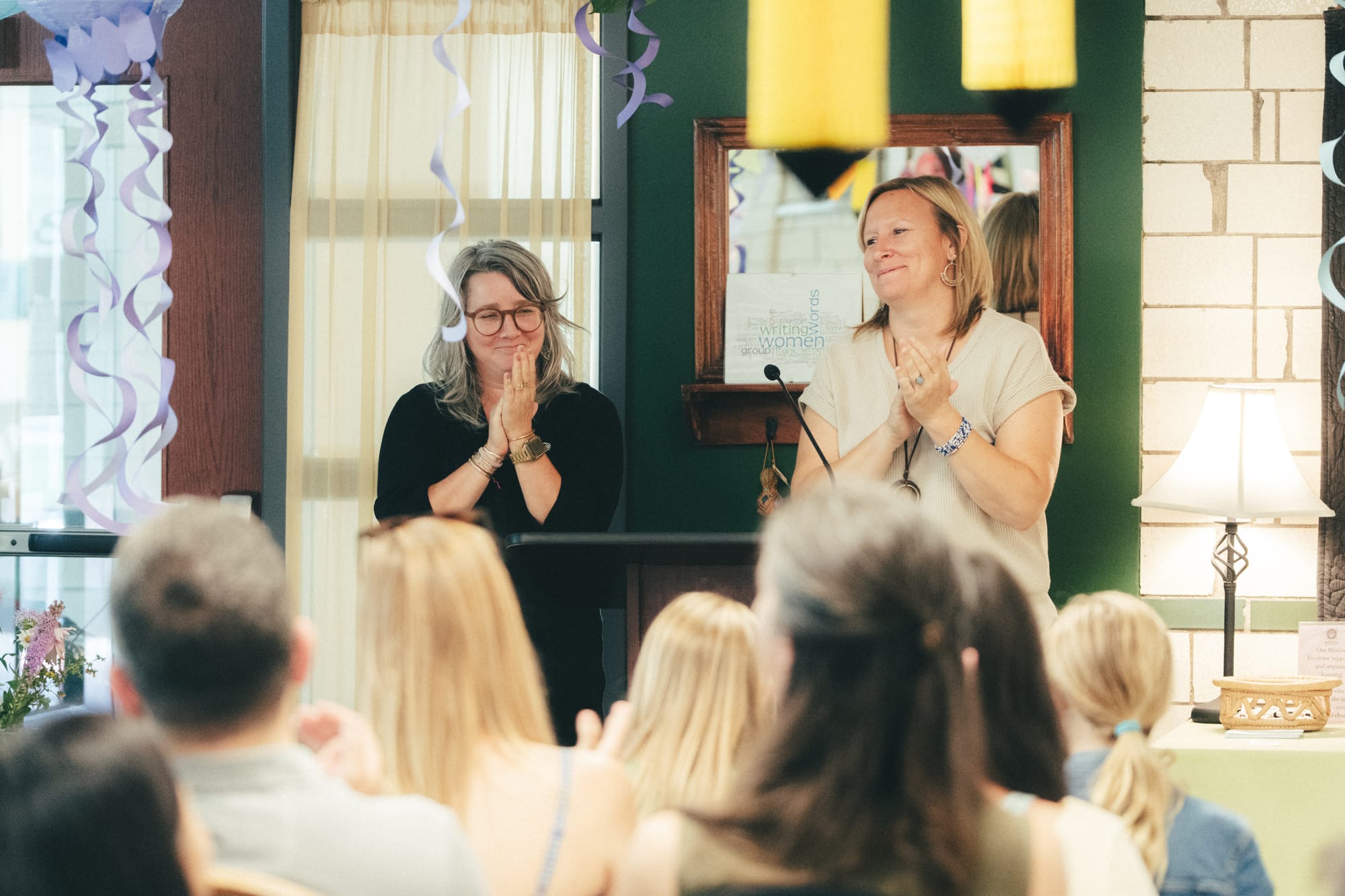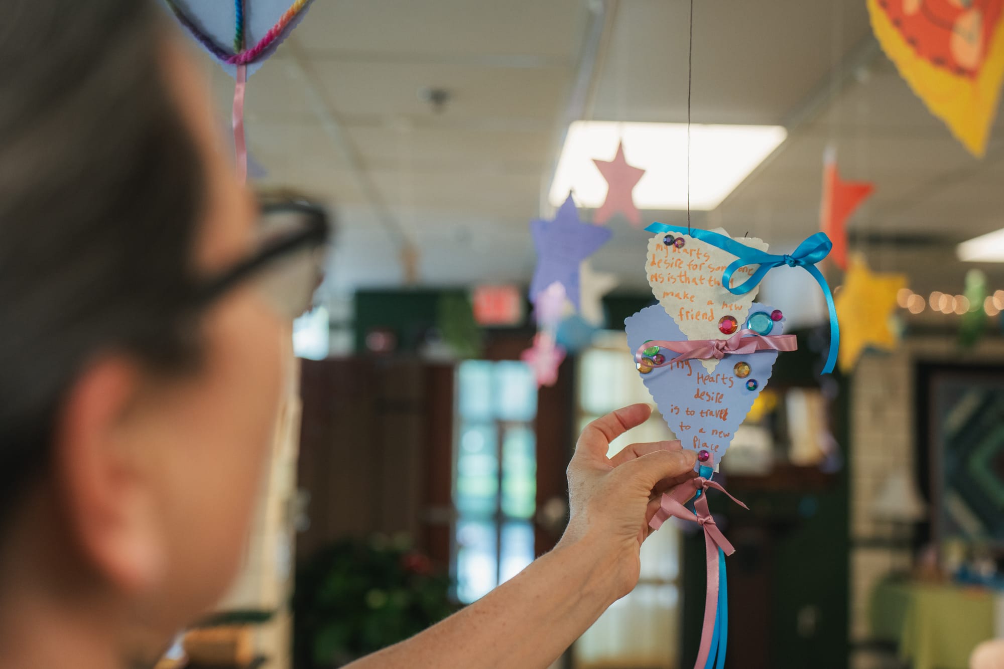 Left: Women Writing for (a) Change creative director Mary Beth O'Brien reads a “heart’s desire” piece. Right: Camp facilitator Ali Meyer reads a camper’s star ornament. (Kelton O'Connell, July 10, 2025)