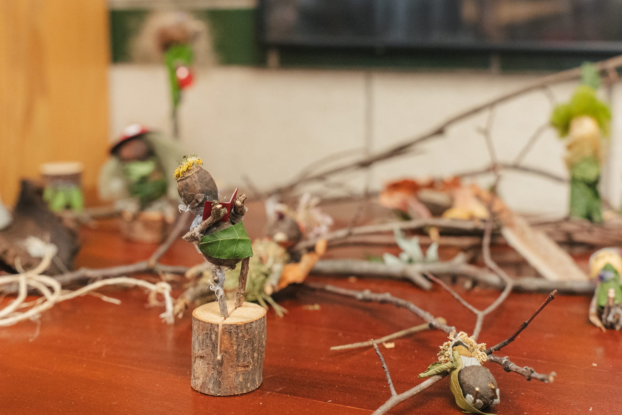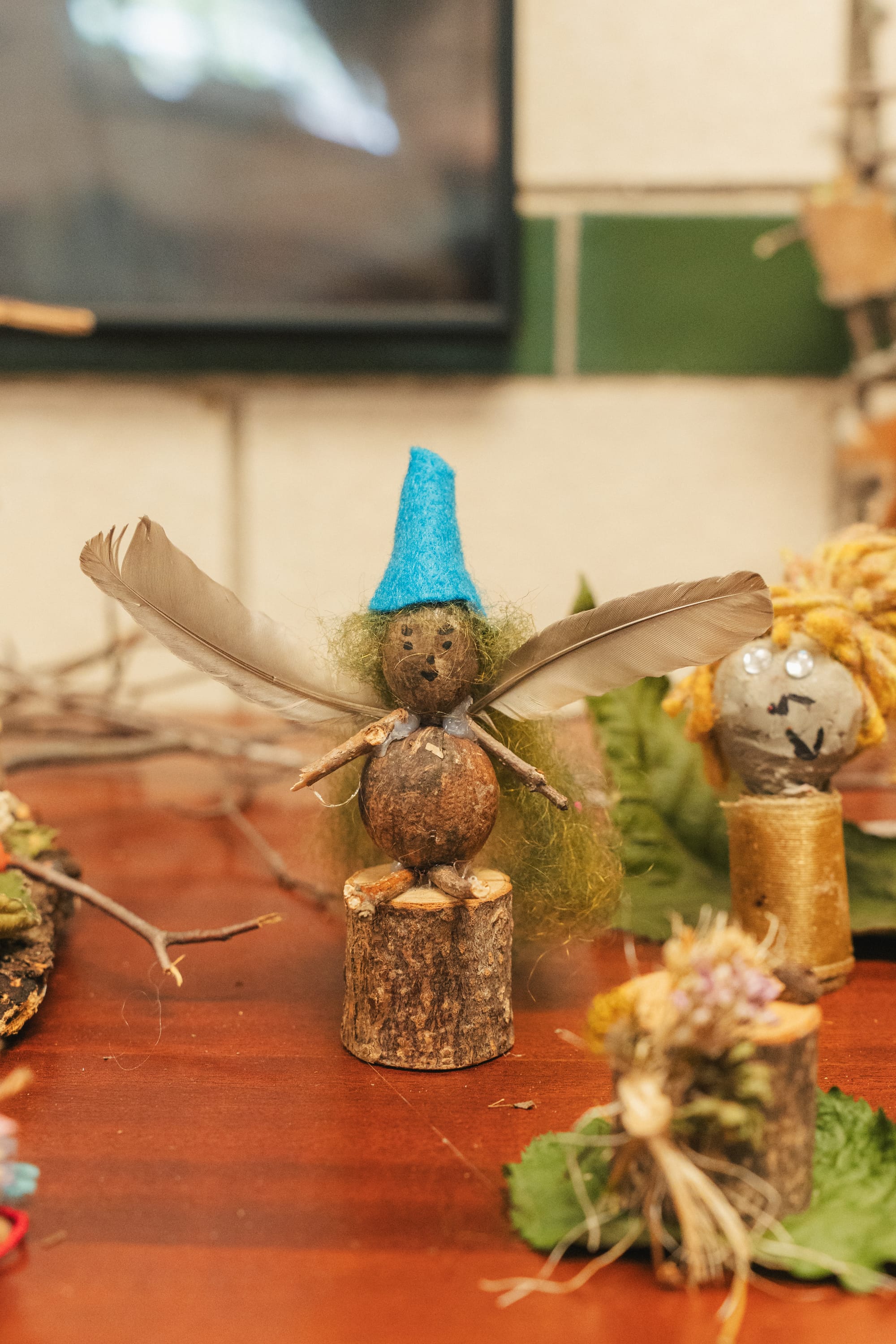 One craft project was the creation of figures from a blend of nature- and human-made objects: twigs, nuts, feathers, and leaves.