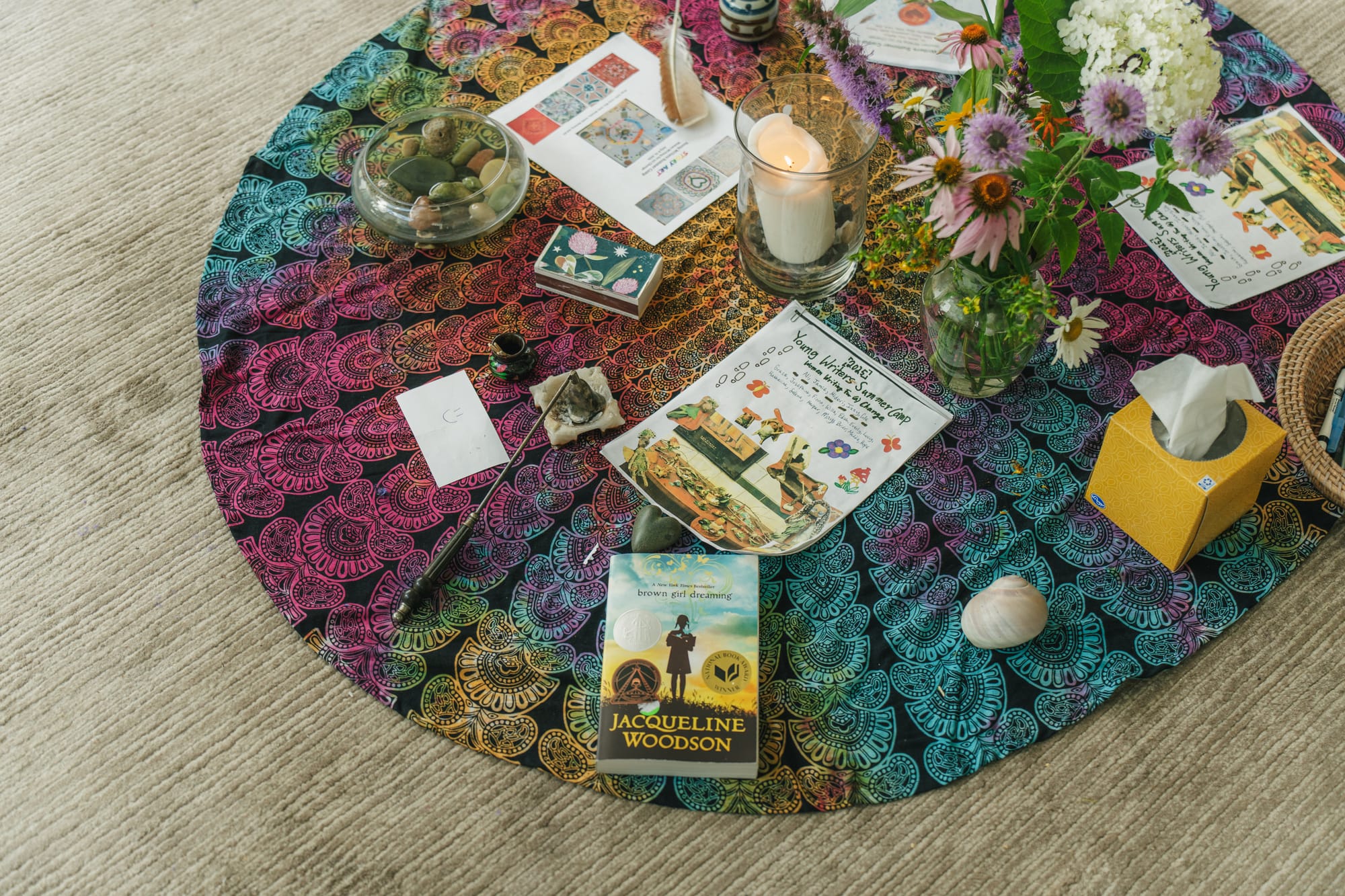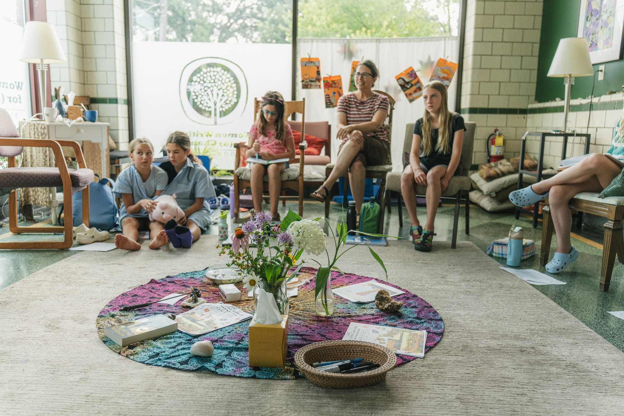 This year’s camps were based on the theme “Adventure Writing.” Last week’s session included two adult facilitators, one high school volunteer, and six campers. (June’s camp had a larger group of 14 girls.) Each day began with a ritual: Everyone is seated in a circle. A chime rings, everyone takes a breath, and a candle is passed around. An epigraph and poem are then read aloud by a camp facilitator to start the day. A talking stone is passed around, and each person takes turns repeating a line from the poem or epigraph that stood out to them.
