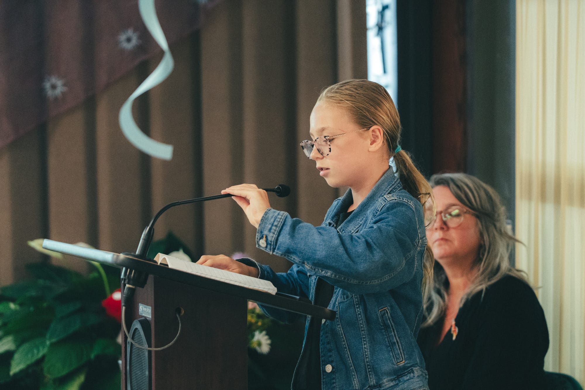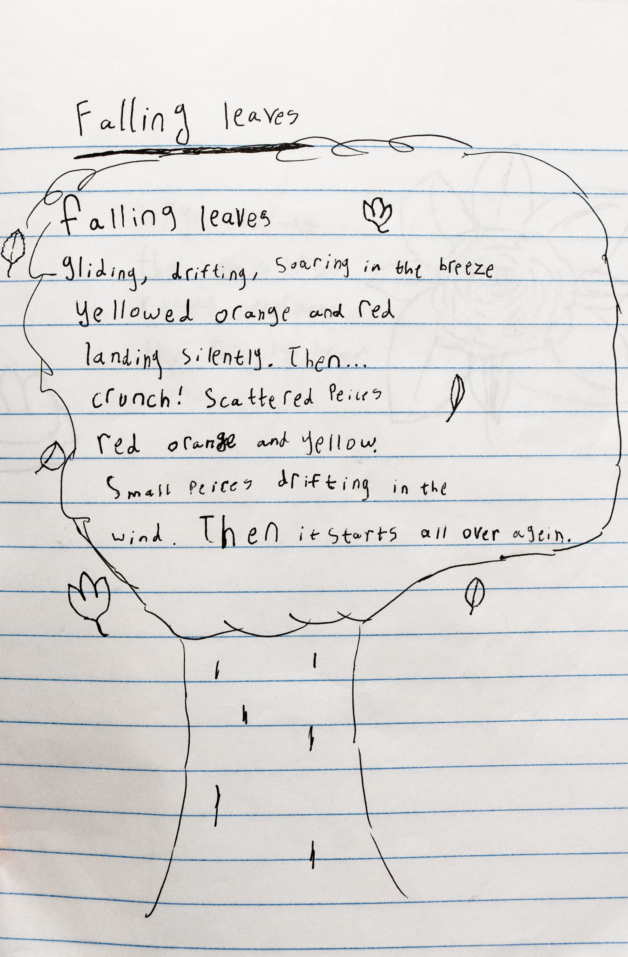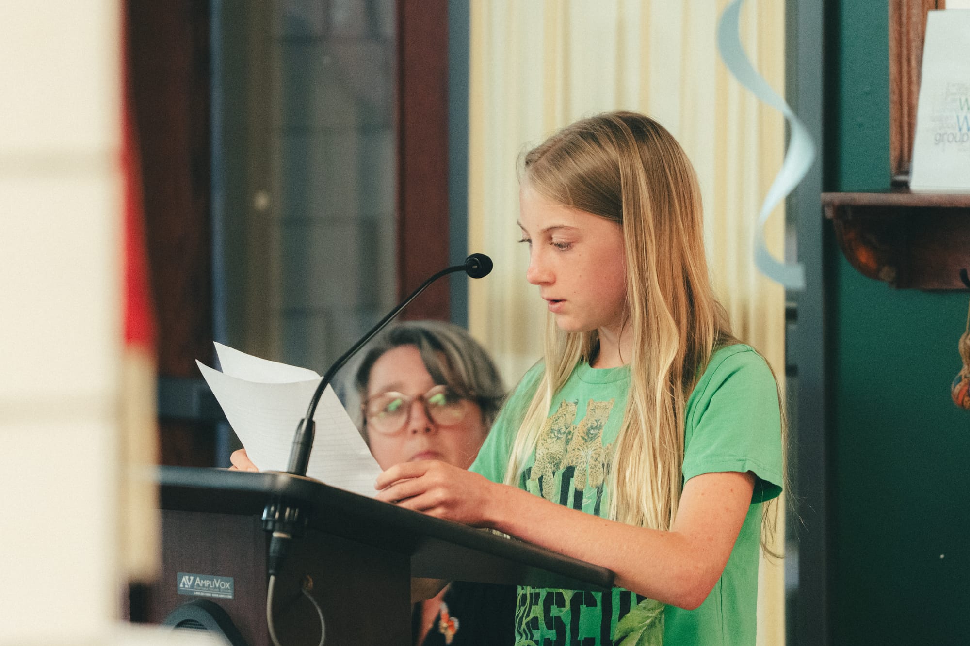 Ingrid, a rising sixth grader, reads a poem she wrote called “Falling Leaves.” Ingrid said she enjoys drawing, and wanted to combine writing with drawing. “All my school notebooks, like half the pages are full of drawings instead of actual work,” she said. “I go through so many notebooks.” (Kelton O'Connell, July 11, 2025)