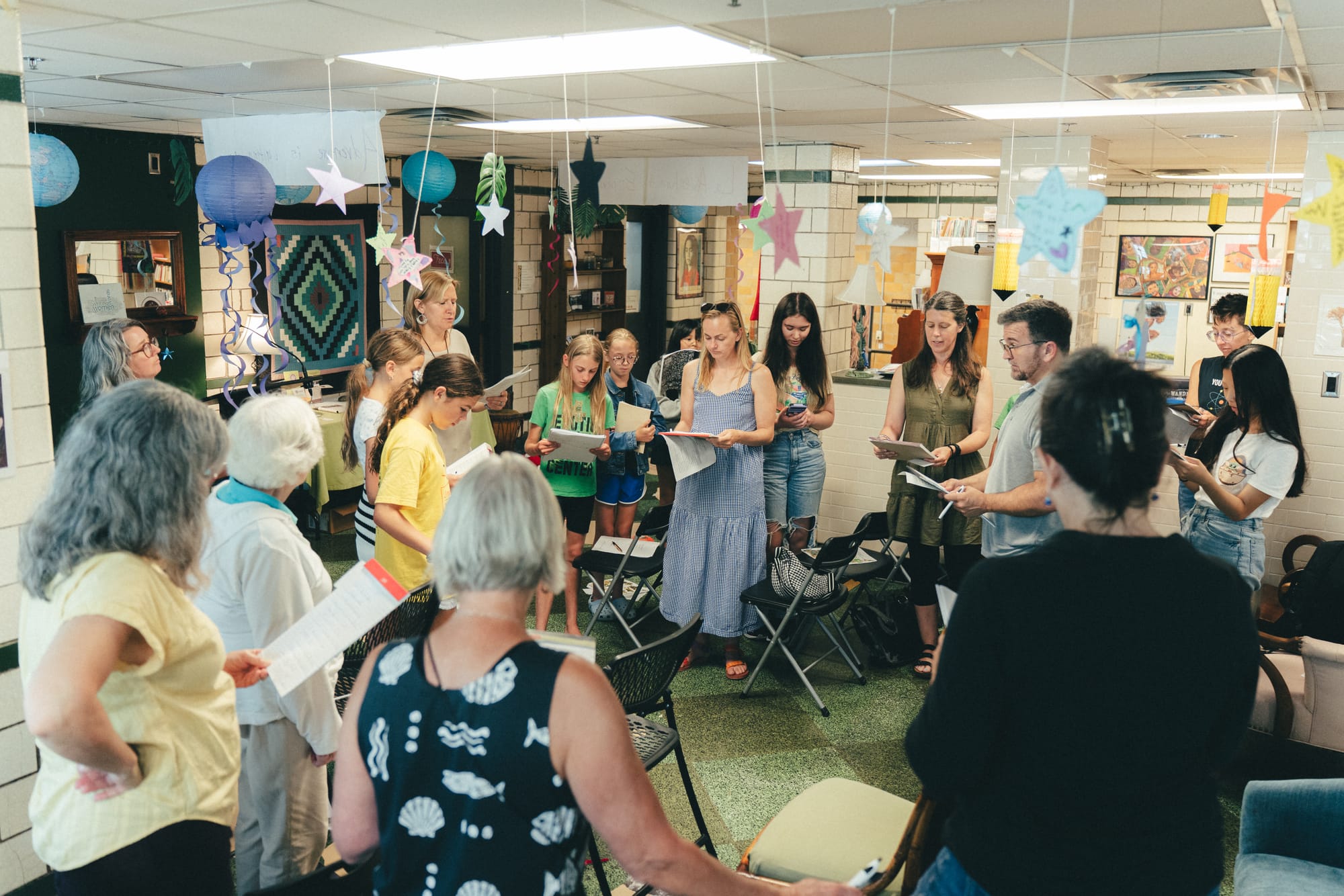 After the pieces were read, everyone stood in a circle for a round of read-back lines. At the start of Friday's read-around, everyone in the room was encouraged to jot down any phrases or lines that stood out to them, just as campers had been doing throughout the week. These lines and phrases were shared aloud by parents and campers, overlapping at times, but each was given space to be heard.