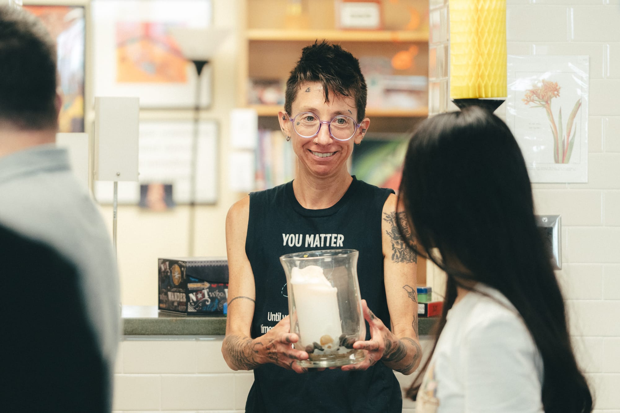 Meyer emphasized the value of these read-back lines: they learn to lift up other people’s words. The candle is meant to help participants focus on their being present, and to allow them to think about what they hope to give to and receive from the circle. The candle is passed again at the end of each day, encouraging writers to think about what they will take home when they leave.