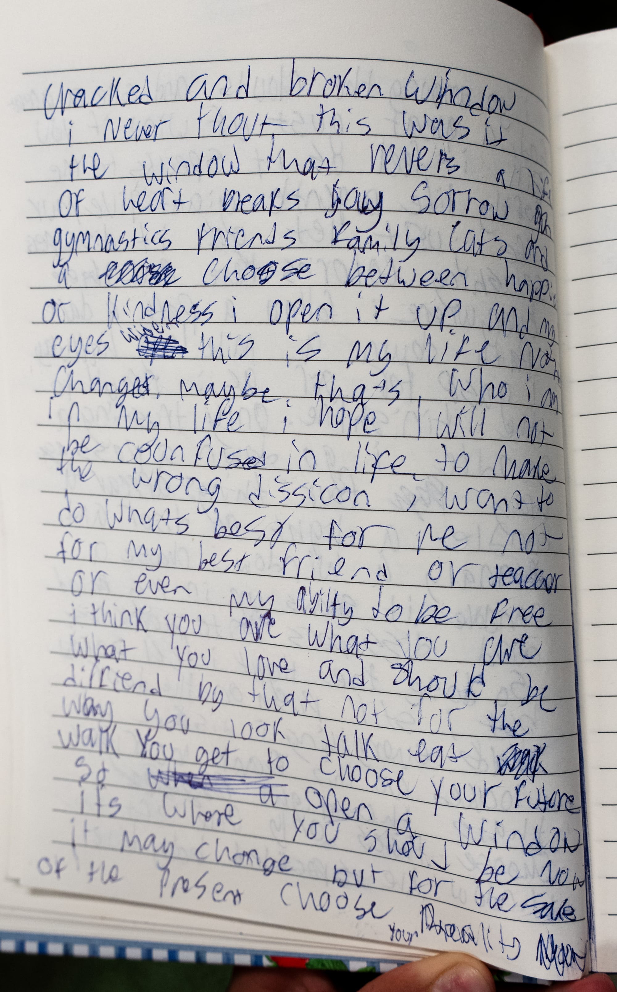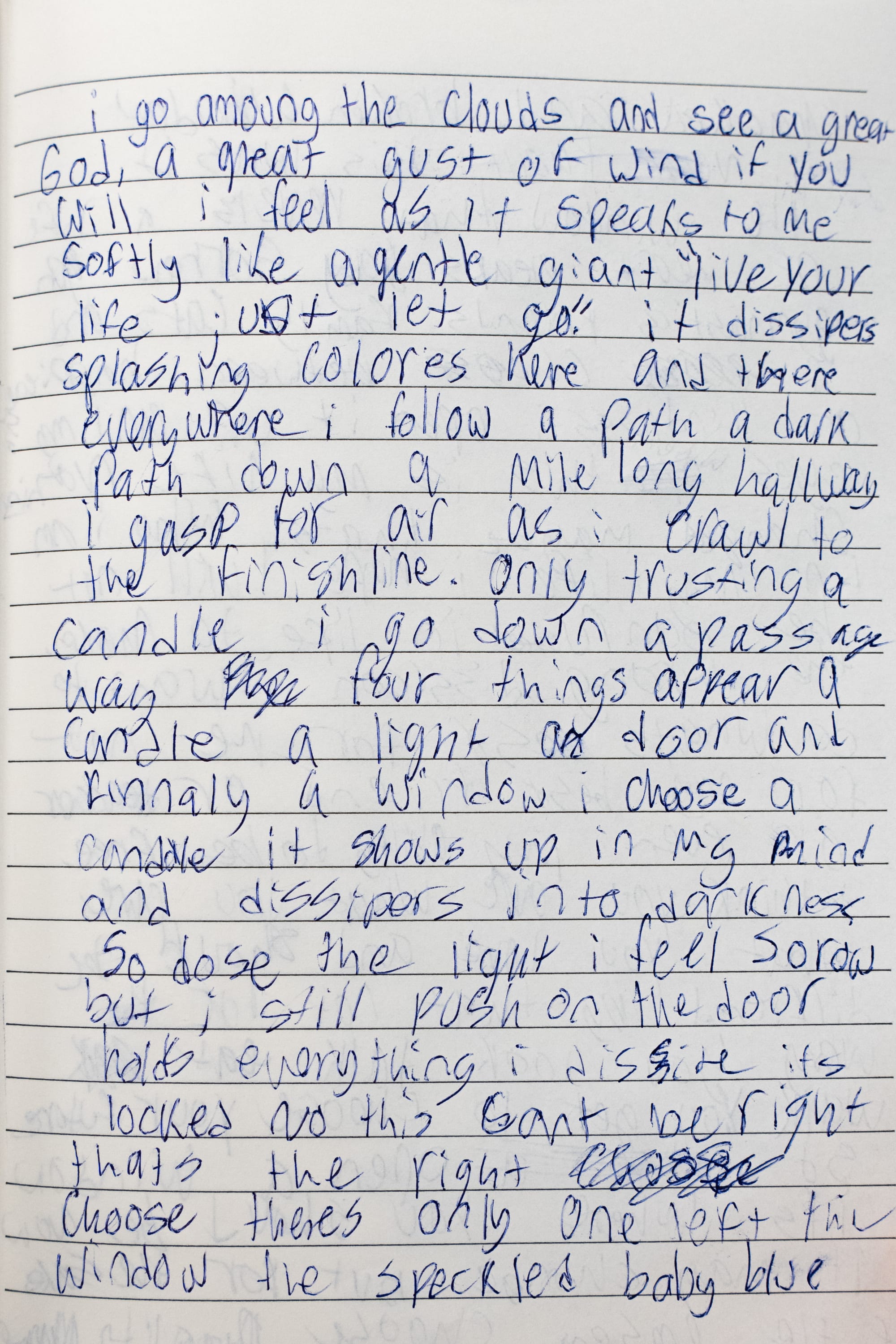 Adult facilitators also write with the girls during the camp. Facilitator Jamie Jackson said, “I love writing poetry mostly, and it’s mostly things I either am observing or processing. So sort of thinking through, in my life: feelings, emotions, thoughts, dreams, experiences—life.”