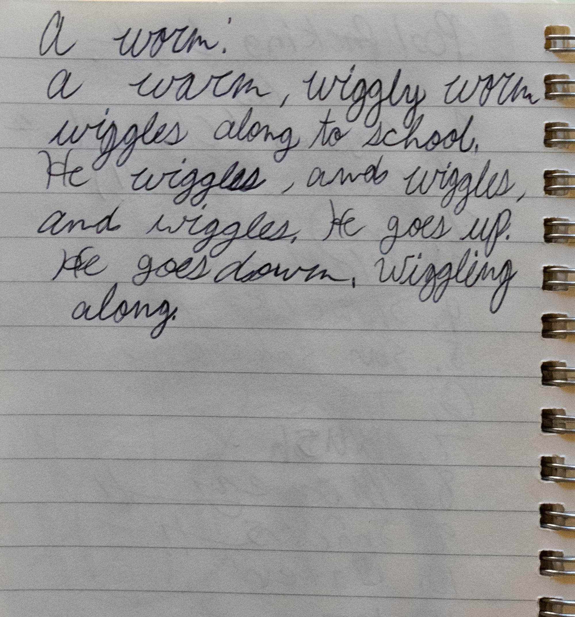 Claire read this piece of writing that does not have a title. She said this piece came from a prompt that began with “I go among the ....” She said, “I love clouds. Whenever I’m on an airplane I look out, and I look at the clouds, and I’ve been wanting to write a piece like that for a while, because it inspires me a lot. It looks like snowy mountains.” (July 11, 2025)